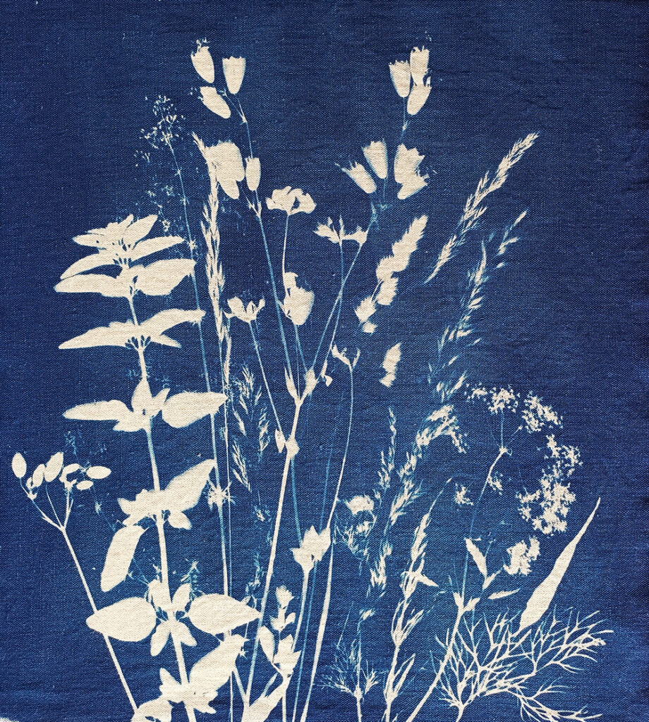 Die Cyanotypie, auch als Blaudruck bekannt, ist ein altes Druckverfahren aus dem 19ten Jahrhundert. Zwei ungiftige Komponente werden mit Wasser angemischt und im richtigen Verhältnis miteinander vermengt. Durch die UV-Strahlen der Sonne kommt es dann zu einer chemischen Reaktion und blaue Bilder entstehen. Man kann unglaublich viel damit experimentieren und es ist immer wieder spannend zu sehen, wie das Blau am Schluss rauskommt oder wie scharf der Kontrast geworden ist.