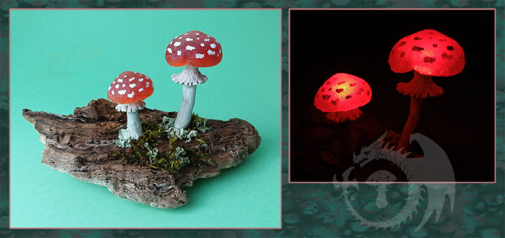 Zwei Abgüsse von echten Pilzen so hergerichtet, dass sie wie Fliegenpilze aussehen. Sie sind mit roten LED bestückt und leuchten somit auch rot. Hatten die Hütchen vorher Kontakt zu Licht, leuchten sie im Dunkeln auch von alleine gelb-grünlich.