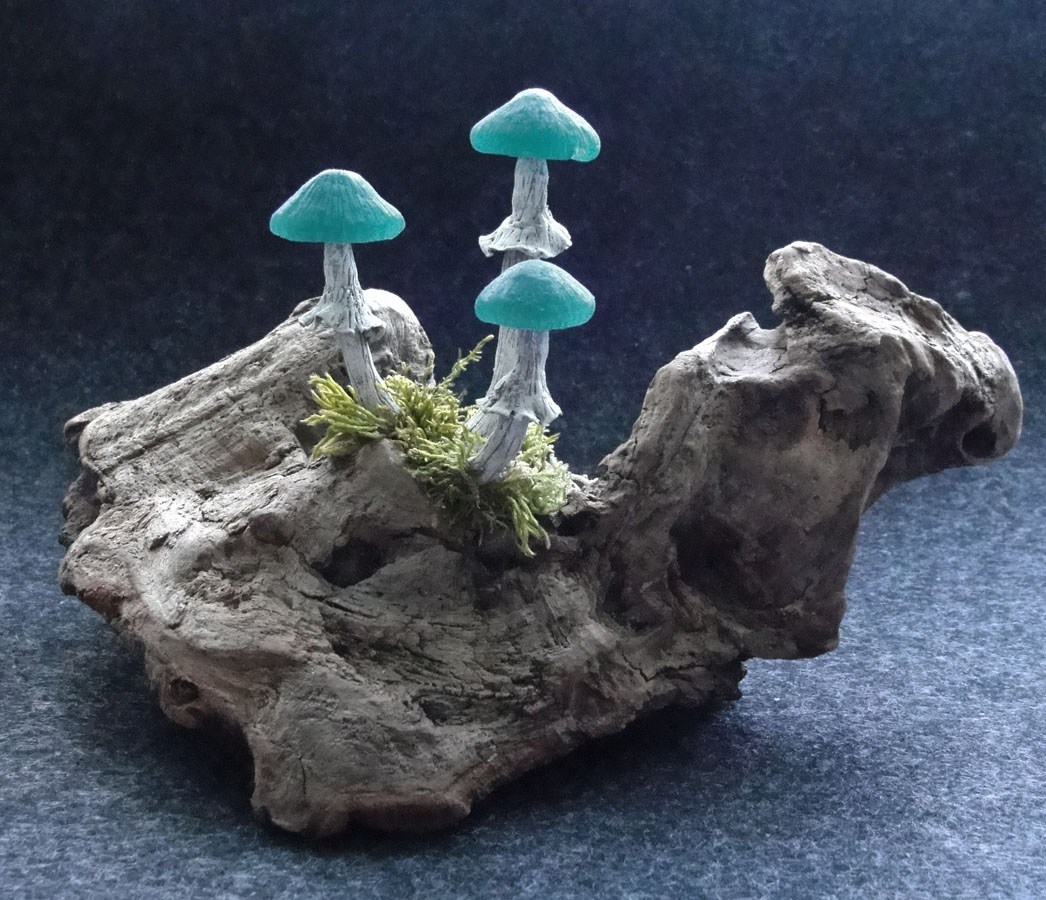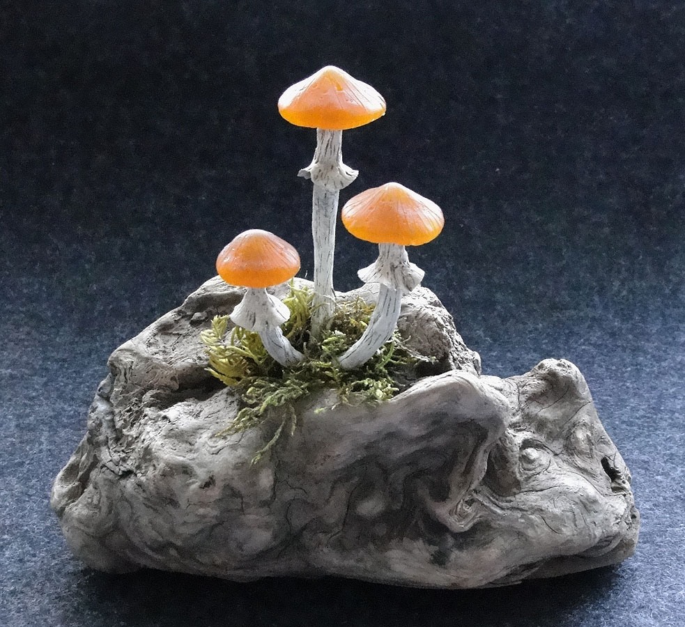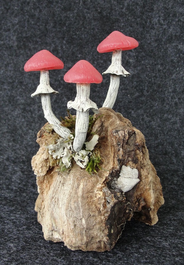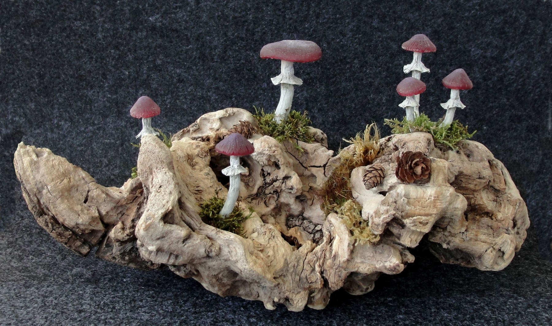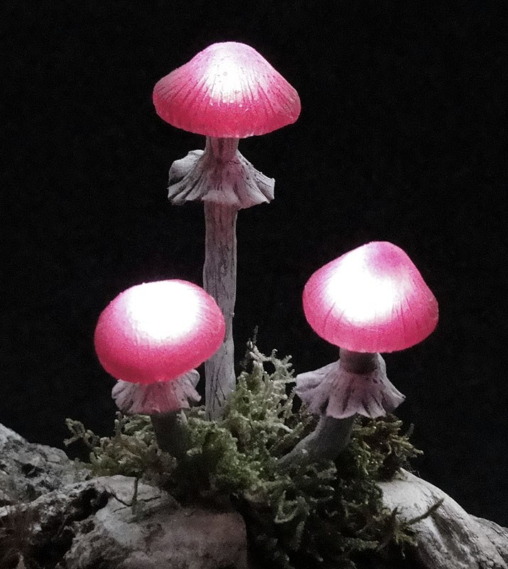 Drei olivfarbene Pilzen auf einem ansprechenden Schwemmholz, das mit Moos und Flechten verziert ist. Die Pilzhüte sind Abgüsse von echten Pilzen! Eingeschaltet leuchten diese gelb-grün.