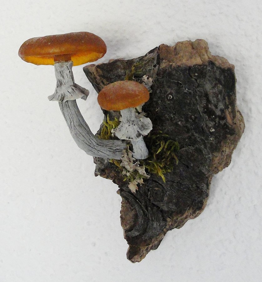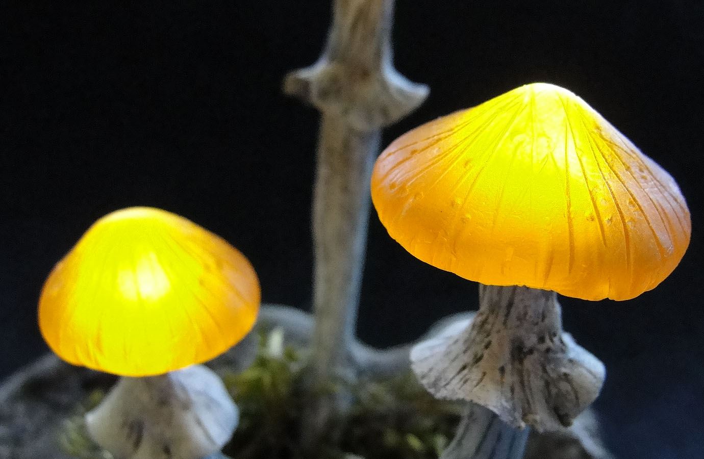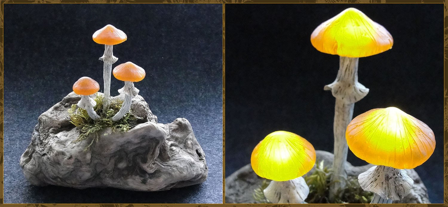Ein Lämpchen der besonderen Art, denn man kann es an die Wand hängen. Die zwei olive-farbenen Pilzhütchen sind mit Nachtleuchtpulver versetzt, deswegen leuchten sie nicht nur im Dunkeln, sondern haben auch ein schönes zweifarbiges Aussehen. Wie in der Natur.