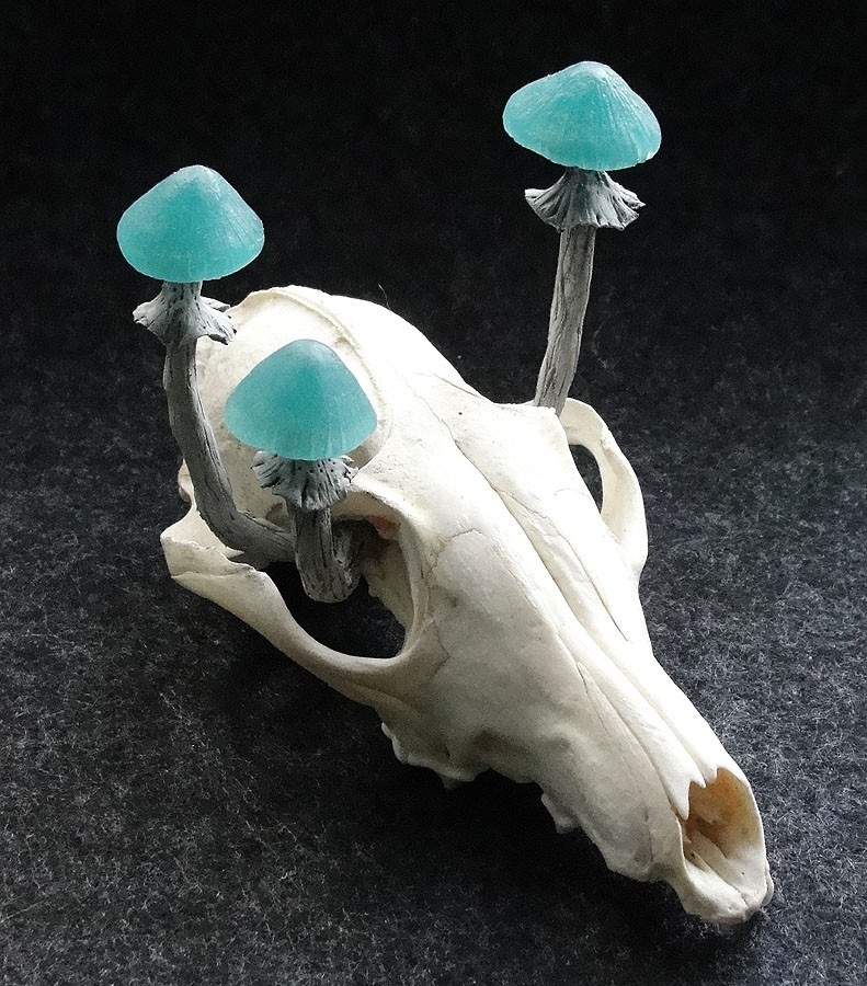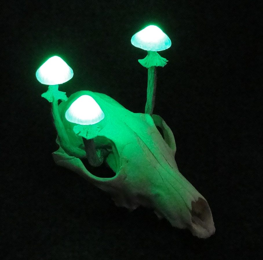 Ein gruseliges Pilzlämpchen der anderen Art. Aus einem alten Fuchsschädel, den ich im Wald gefunden habe, spriessen drei seegrüne Pilze hervor, die im Dunkeln schaurig giftgrün leuchten. Es wurden grüne LED benutzt, das Licht ist somit punkig. Die Kabel und Batterien sind im Schädel versteckt und von vorne nicht sichtbar.